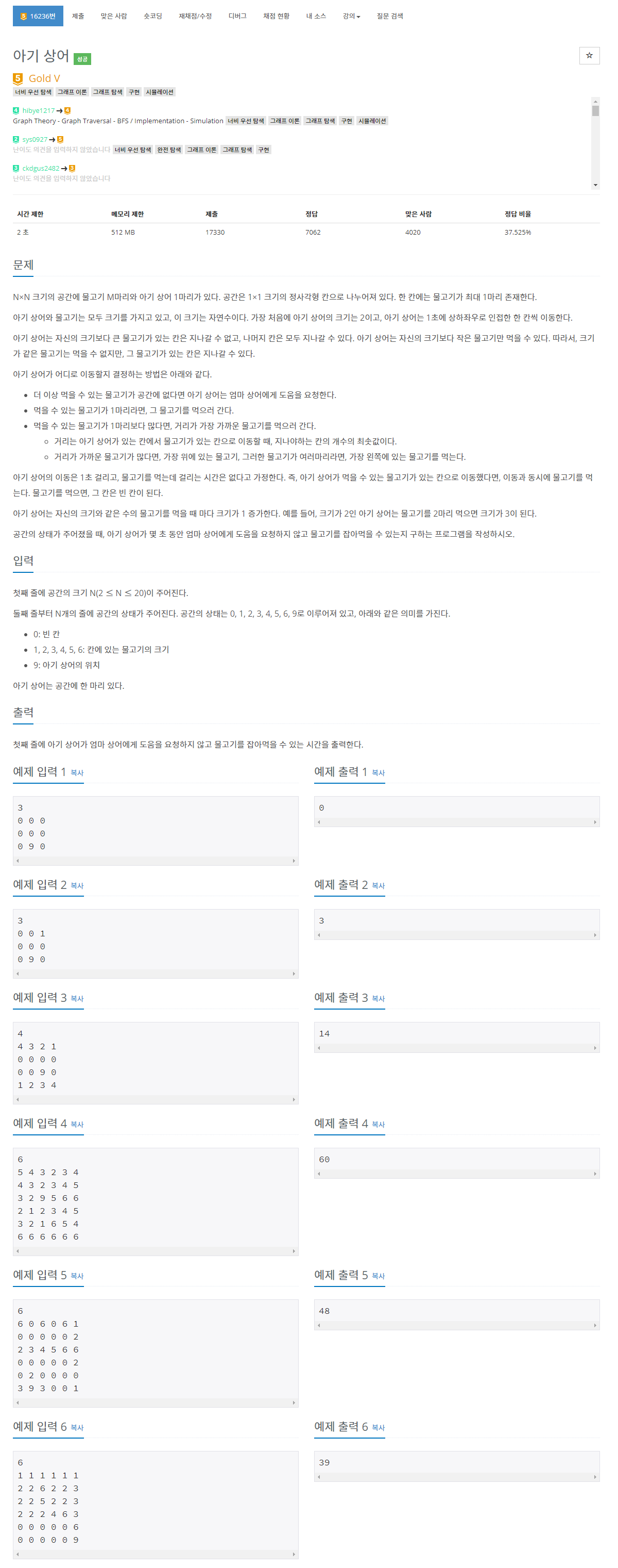 N×N 크기의 공간에 물고기 M마리와 아기 상어 1마리가 있다. 공간은 1×1 크기의 정사각형 칸으로 나누어져 있다. 한 칸에는 물고기가 최대 1마리 존재한다. 아기 상어와 물고기는 모두 크기를 가지고 있고, 이 크기는 자연수이다. 가장 처음에 아기 상어의 크기는 2이고, 아기 상어는 1초에 상하좌우로 인접한 한 칸씩 이동한다. 아기 상어는 자신의 크기보다 큰 물고기가 있는 칸은 지나갈 수 없고, 나머지 칸은 모두 지나갈 수 있다. 아기 상어는 자신의 크