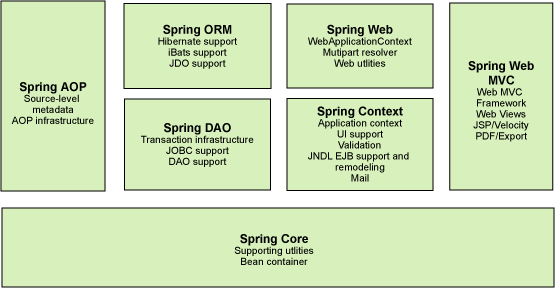 📌 Spring Core 바로 위에 있으면서 Spring Core 에서 지원하는 기능 외에 추가적인 기능들과 좀 더 쉬운 개발이 가능하도록 지원하고 있다. 또한 JNDI, EJB 등을 위한 Adaptor 들을 포함하고 있다.