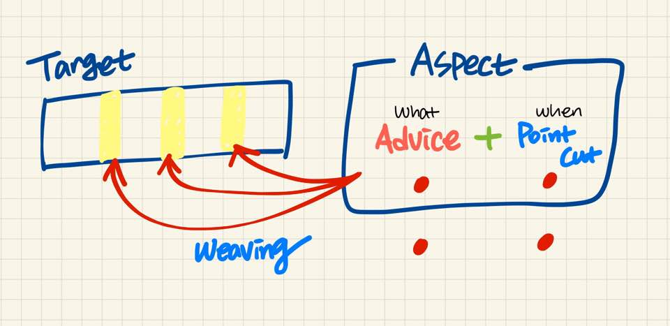 📌 여러 객체에 공통으로 적용되는 공통 관심 사항 클래스로 Aspect = Advice + Point Cut 으로 나타낼 수 있다.