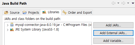 Add External JARs 를 클릭하여 위의 경로의 mysql-connector-java.x.xx.xx.jar 파일을 추가하고 Apply and Close 를 눌러준다.